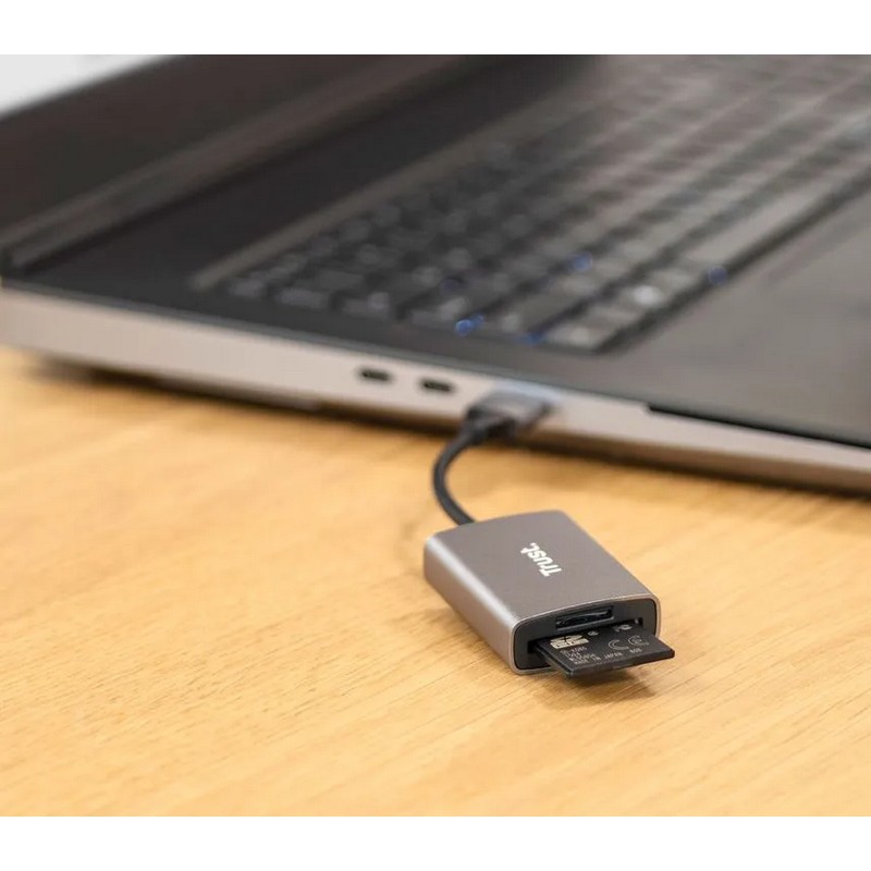 Kompaktan, aluminijski čitač kartica sa standardnim USB priključkom za korištenje s (mikro) SD karticama.