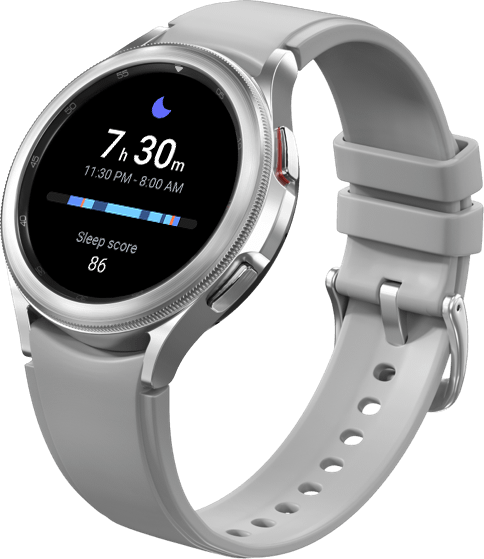 Prikazan je srebrni Galaxy Watch4 Classic uređaj sa kružno zakopčanim srebrnim remenom, a na njegovu se licu sata prikazuje značajka praćenja spavanja.